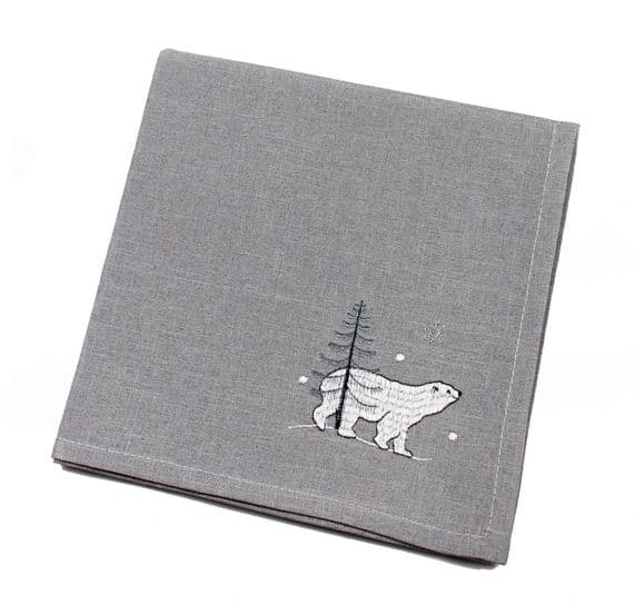 Elevate your Christmas table with our Embroidered Polar Bear Design Napkin in Grey. Featuring a charming polar bear motif, these napkins add festive flair to any meal. Crafted with care and durability in mind, they're perfect for Christmas gatherings and cosy winter dinners. Beautifully embroidered Christmas, Winter, Festive Napkin - Featuring a polar bear. Sold as singles to allow you to purchase the exact number required for your table setting. 45cm x 45cm. 100% Polyester for easy washing. Matching Napkin featuring a penguin, table runner and cushion also available update