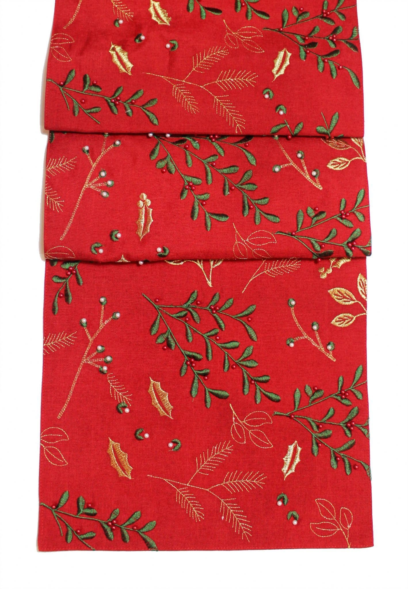Berry Beads Christmas Embroidered Holly Leaves & Pine Branchs Table Runner 14" x 75" - Red