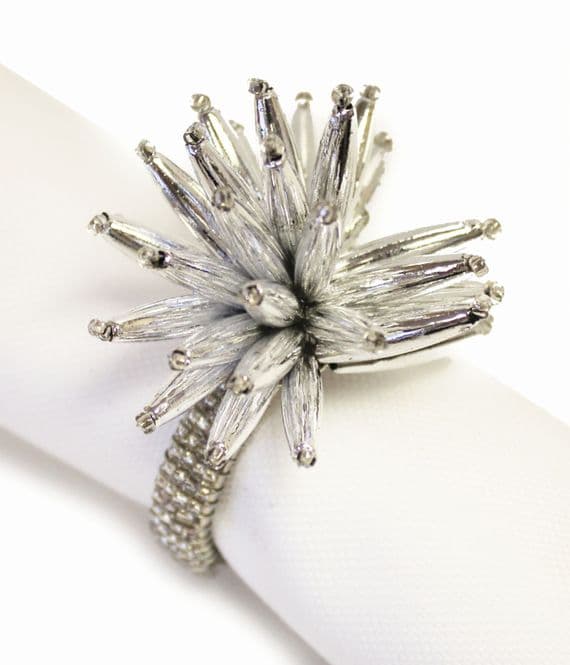 Elevate your table setting with our stunning silver starburst beaded napkin ring. Radiating elegance and sophistication, this exquisite accessory adds a touch of glamour to any dining experience A starburst in beadwork forms this silver napkin ring Adds a touch of glamour to your table setting while keeping your napkins neat and tidy One Size Sold as singles to allow you to purchase the exact number required for your Christmas table setting Can be matched to a wide range of table linens. Also available in gold update