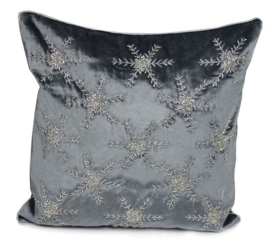 Elevate your winter decor with this stunning pewter velvet look sparkly cushion, adorned with delicate beaded snowflakes and contrast silver piping. Metallic beads and silver piping adorn this cushion with snowflakes Ideal to create a sparkling Christmas theme. Also available in an off white colourway45cm x 45cm100% Polyester for easy washing Cushion supplied with inner and the cover has a zip opening update