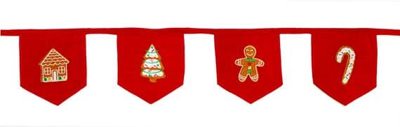This stunning embroidered bunting is the perfect accent for your Christmas decorations. Adorned with charming embroidered gingerbread men and sugar cookie treats , it infuses your home with fun festive cheer. Gingerbread cookies embroidered on red fabric Bring a touch of fun nostalgia to your Christmas décor210cm100% Polyester for easy washing Matching napkins, table runner, cushion, adults apron, child's apron, double oven glove and paper bunting available to co ordinate your Christmas table setting and décor update